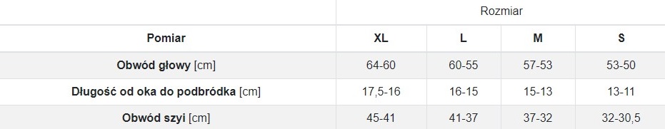 Należy pamiętać, że każdy ma inny kształt głowy i tabele są pomocą oraz wskazówką przy wyborze rozmiaru, jednak w celu dokładnego dopasowania maski zapraszamy do salonów stacjonarnych lub prosimy o napisanie wiadomości mailowej (rozmiary@respro.com.pl) z podanymi wyżej pomiarami. Zachęcamy do starannego wyboru rozmiaru maski, albowiem po pierwsze dobrze dobrana maska znacząco zwiększa ochronę przed zanieczyszczeniami, a dodatkowo zakupionego i otwartego produktu nie można zwrócić ze względu na ochronę zdrowia oraz ze względów higienicznych.