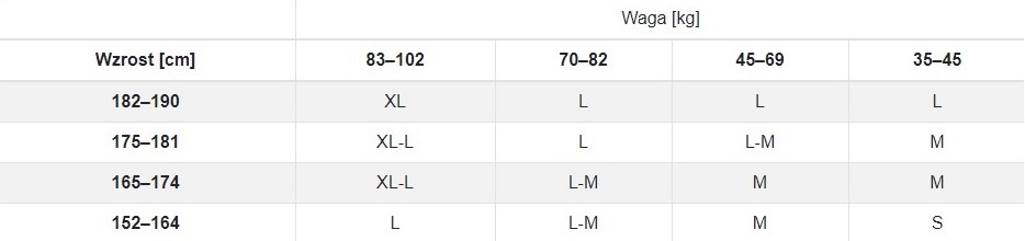 Po dokonaniu wyżej wskazanych pomiarów porównaj je ze wskazanymi w poniższych tabelach i wybierz odpowiedni rozmiar.
